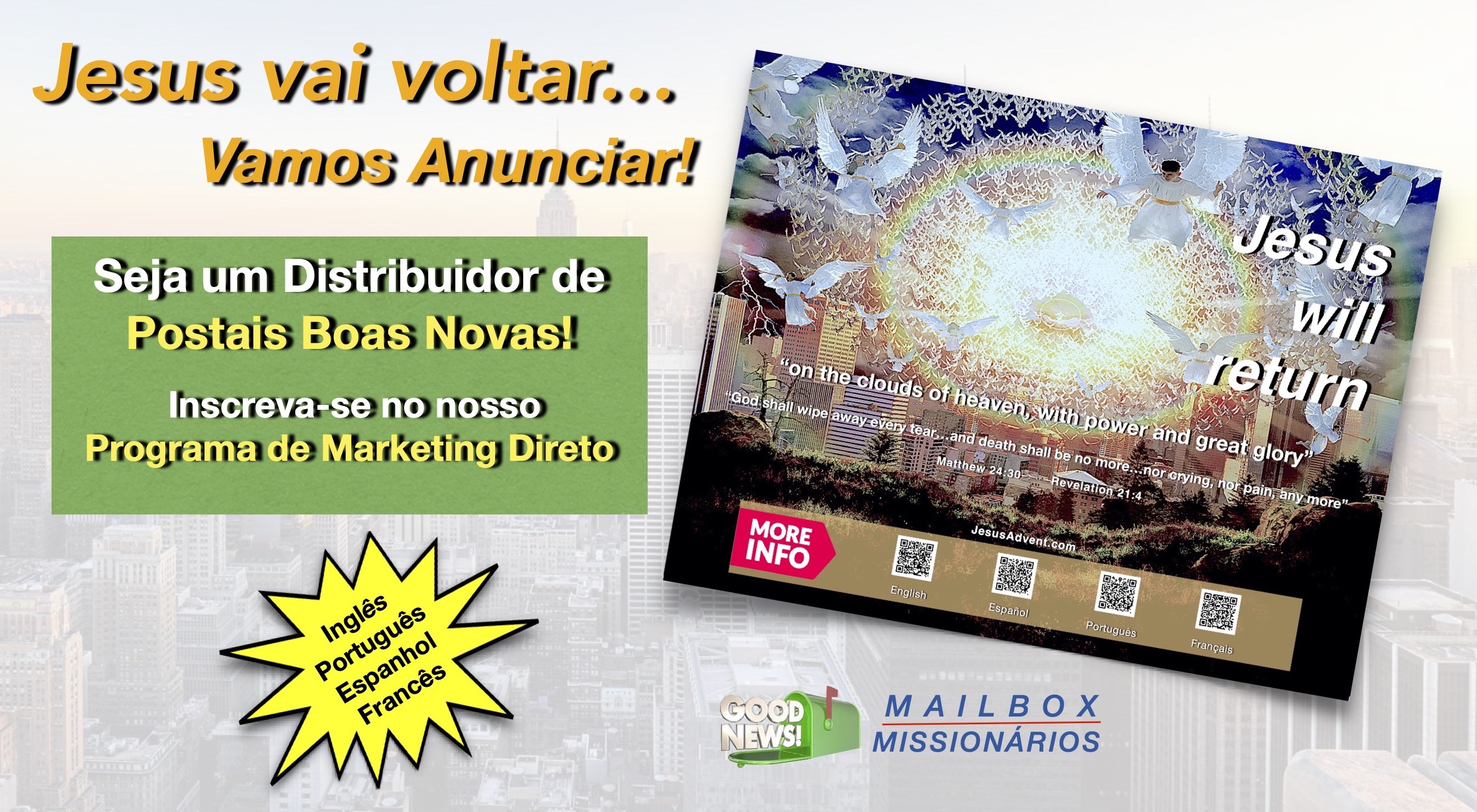 Ao patrocinar o envio desses Postcards você estará espalhando a mensagem das Boas-Novas diretamente para os lares das pessoas.Pessoas que talvez nunca participariam de uma reunião em qualquer igreja ou local e provavelmente nunca lhe convidaria para visitá-las em seus lares - mas elas recebem correspondências pelo correio quase todos os dias!Você pode ajudar a anunciar que Jesus Vai Voltar trazendo esperança, conforto, convicção e conversão para um mundo que está perecendo. Good News Postcards são desenhados, impressos e enviados por nós, incluindo selo postal, diretamente para endereços em várias rotas postais nos Estados Unidos. O custo é aproximadamente $1 por cartão! Esta é uma oportunidade especial para iniciar seu próprio Ministério Postal! Junte-se a nós hoje mesmo! Espalhe as Boas-Novas! Você pode começar com apenas $25 mensais - cerca de 83 centavos por dia!